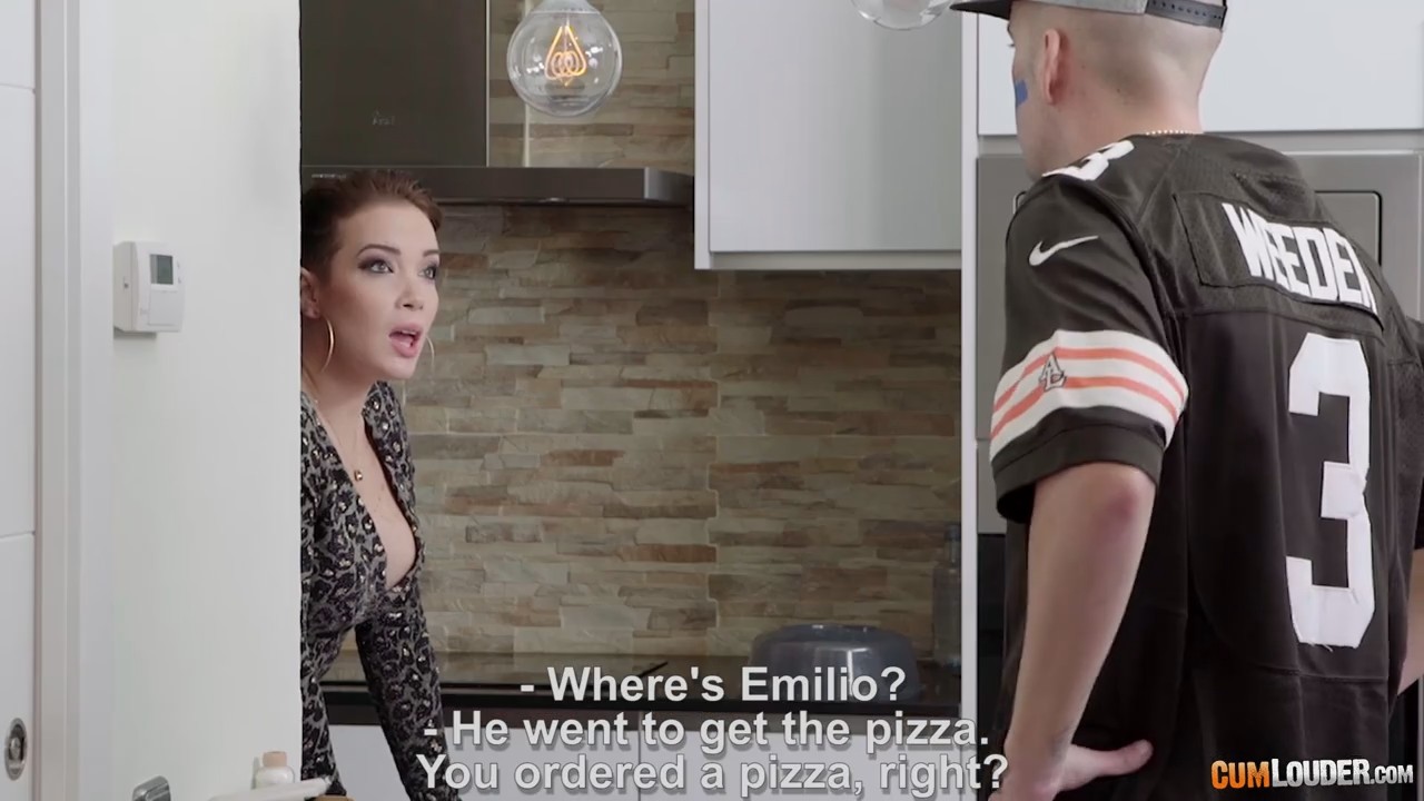 Привлекательная телочка тщательно подготовилась, представляя себе идеальный романтический вечер с продолжением в объятиях любимого. Но все пошло не по запланированному девушкой сценарию - ведь важная дата для нее совпала с финалом важного матча для него. Расстроенная милашка уходит на кухню, но вскоре печаль исчезает с личика и в глазах начинают плясать озорные огоньки - шлюшка нашла, с кем скрасить вечер. И выбор пал, конечно же, на друга, с которым пришел ее мужчина. Достаточно быстро соблазнив гостя, милашка была отжарена на кухне по полной программе. Мало того, что изменила невнимательному супругу чуть ли не у него на глазах, так она еще и сперму, вылетавшую из члена, направила на пиццу, которую также забрал невнимательный рогоносец.