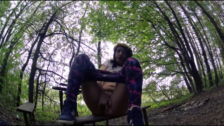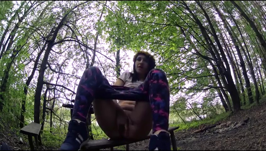 Сексуальная брюнетка в шляпе во время прогулки по лесу очень возбуждается. Девушка случайно натыкается на стол и скамейки, присаживается и начинает дрочить киску пальчиками, слегка приспустив штаны.