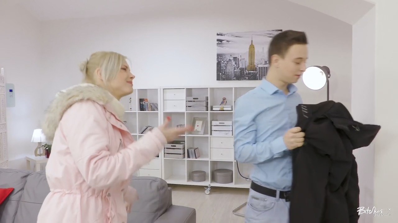 Красивая блондинка долго искала работу, и наконец, на дверях какого-то богом забытого гаража, нашла приклеенный лист формата А4 с очень интересной вакансией. Ей она так понравилась, что девушка просто встала в проходе и взахлеб читала требования к кандидату. Но тут мимо прошел чувак, "случайно" выронил у нее листовку из рук и растоптал ногой. "Ой, девушка, не расстраивайтесь! У меня есть для вас отличная, высокооплачиваемая работа!" - сказал он, после чего пригласил домой, щедро выебал в задницу, а затем кончил в рот, заставив засовывать ее себе в район лобка. Отличный работодатель, скажем мы вам!