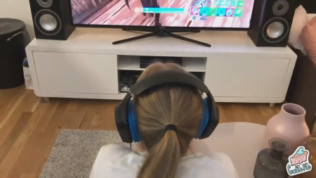 Выпячивать попку и прогибать спину при игре было фатальной ошибкой со стороны девушки-геймерши. Да еще и в одних трусиках. Девчонка еще даже не начала толком "катку", а стройную задницу уже лапал ее парень. Хотя может на это и был расчет. Девчонка была захвачена происходящем на экране, и поэтому не сильно отвлекалась, даже когда сосала член. А уж когда блондинке он так же раком засадил сзади, так та вообще только немного охала, но в целом продолжала залипать в игру. Мужик кончил ей на попку и был таков, а та так и продолжила залипать в ныне популярный "фортнайт".