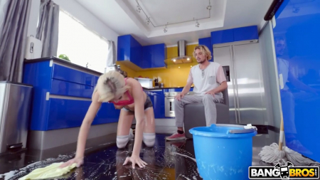 День у молодой домработницы не задался изначально - опоздала на автобус и опоздала к хозяевам дома на первую встречу. Кудрявый парень и его мамочка засомневались в способностях этой леди к уборке, уж очень складно она выглядела - они даже принесли уборочный инвентарь на кухню. Но блондинка уронила швабры и показала свою полную некомпетентность - мать разоралась и свалила, а вот кудрявый решил ее наказать, раздев до трусов и начав возить ею по мыльному полу, чтобы убрать разводы хотя бы ее телом. Правда потом он пришел в себя и быстренько сделал ей поощрительное куни, а потом и вовсе довел ее до струйного оргазма.