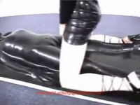 На полу лежит мужчина, полностью завернутый в латекс, из которого откачали воздух. На его лице прикреплен черный резиновый член. Девушка облизала его и стала насаживаться на него, а мужчина внизу постепенно задыхаться. На его счастье, все это продолжалось недолго, телочка слезла, поцеловав на прощание игрушку.