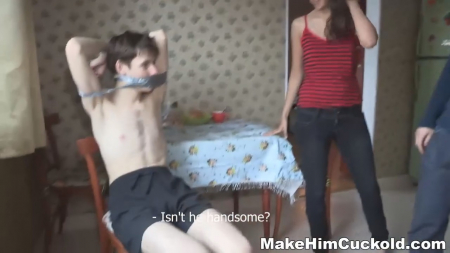 Обычный питерский вечер, кто-то звонит на телефон. Это подруга Катя, которая спешит доложить об измене парня ответившей на звонок девушки. Русская смекалка сразу выдала план мести: пригласить молодого человека к себе, связать его и заставить изменщика смотреть как она трахается с другим, так сказать отомстить изменой на измену. Набрав номер молодого человека, брюнетка попросила быстрее прийти к ней, а когда он заявился, якобы после пробежки весь вспотевший, то предложила потрахаться прямо сейчас, но нужно попробовать кое-что новое - связанные руки. Как только его рот был заклеен скотчем, а руки зафиксированы, подружка позвонила некому Мише, обронив про свободный вечер. Ебарь примчался за 10 минут, застав связанного изменщика сидящего на стуле. Первым делом Мишаня пнул щуплого паренька и стал раздевать подругу, заставив смотреть на половой акт и слушать громкие стоны пожалевшего обо всем на свете молодого человека.