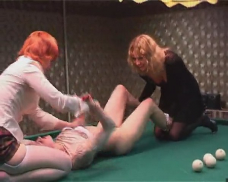 Подружки под русскую попсу играют в бильярд. В комнату зашла неизвестная им девушка, которая стала мешать катать шары, толкая их и всячески затрудняя игру. Ее попросили несколько раз прекратить, но она игнорировала и продолжала бить бильярдные шары друг о друга. Подружек это довело и они набросились на агрессивную незнакомку, повалив на стол, сняв с нее одежду и насильно выебав. Та только этого и добивалась, поэтому расслабилась и стала получать удовольствие от лесбиянок лежа на столе для бильярда.