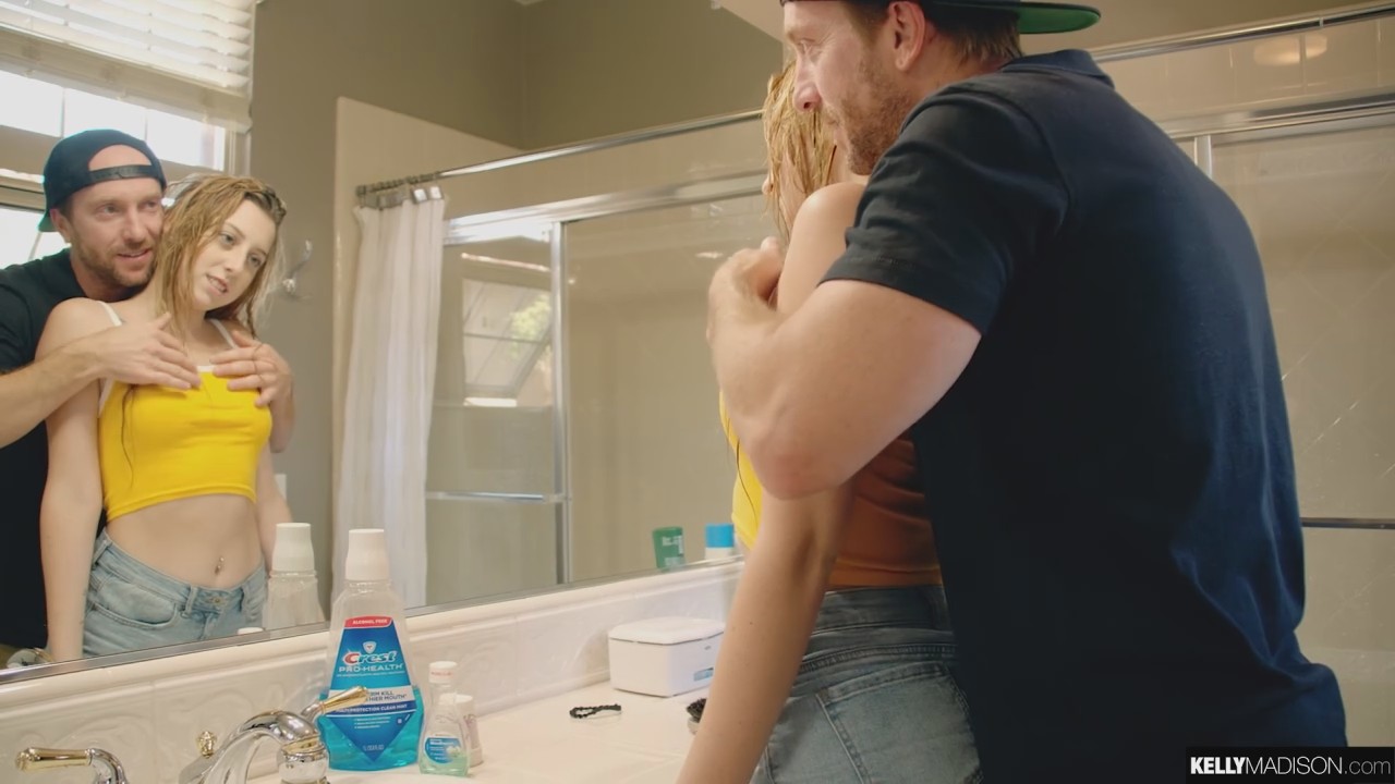 Кудрявая милашка намывает себя после тяжелого трудового дня, а вот ее бойфренд весь день гонял балду. Поэтому совершенно не удивительно, что дать домыться он ей не успел и решил взять красотку прямо там. Правда стоять под водой вместе с ней было ему некомильфо, он все-таки одет как ссаный батл-рэпер, в кепочке. Поэтому широкая раковина оказалась как нельзя кстати - он взгромоздил ее попку на фаянс и начал хорошенько трахать. Но ебаться в санузле оказалось так себе, так что вскоре веселый и конкретный трах продолжился на кровати в гостиной с окончанием на задницу.